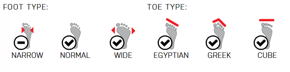 - Unusual toe shape (like Cube or Greek) ? Ozone Plus, Rental, or Hero will be more forgiving.